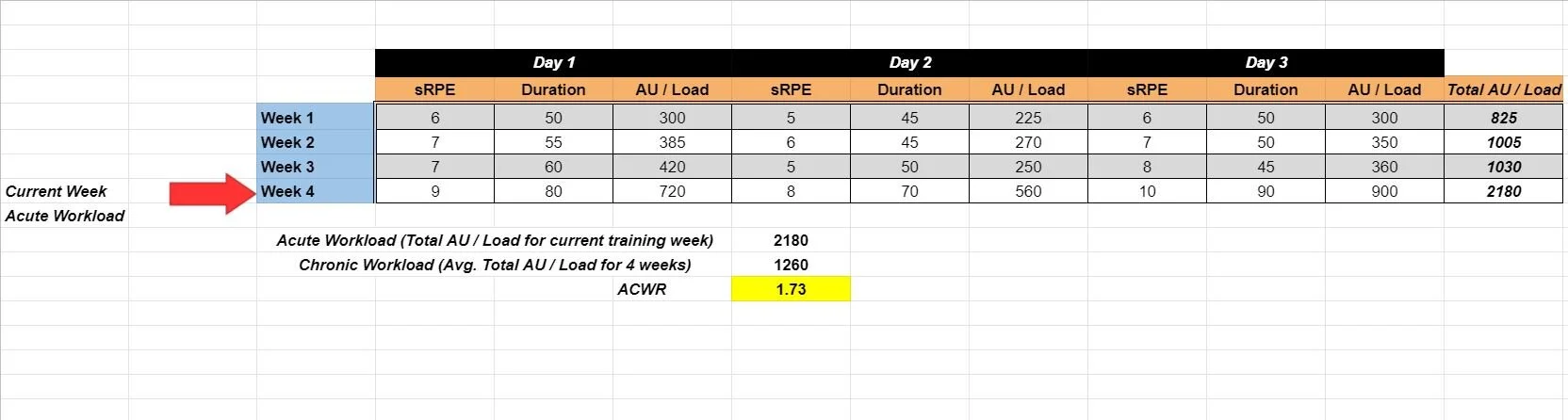 sRPE is the perceived intensity of an entire training session on a scale of 1 - 10. For example, if your workout was to sit on the couch for an hour you’d call that a 1 while running hills for 3 hours non-stop would be considered a 10. The researchers determined that by using sRPE and session duration you can get a value called arbitrary units (AU). These units could then be used with ACWR to determine if your jumps in training load are too much, too little, or sufficient. ACWR is a ratio between acute training (generally a week) and chronic training (generally 4 weeks) load. Essentially, we are comparing the short term or planned workload of our current training week (acute) to our long term, previous training history over the past 4 weeks (chronic). When calculated, we want ACWR to be .8 - 1.3. Less than .8 and the training stimuli may not be sufficient for positive adaptation, while greater than 1.3 (some research may suggest 1.5) and this may be indicative of too large a jump in training load.