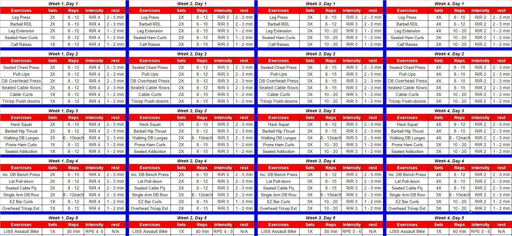 To sum up all the principles discussed above, here is a sample 4 week program for someone who can train 5X / week. Let’s assume this individual has 1 year of training experience with resistance training and is simply looking to increase their overall muscle mass. I’m going to have this individual do 2 upper body days, 2 lower body days, and one day of low intensity steady state (LISS) training.